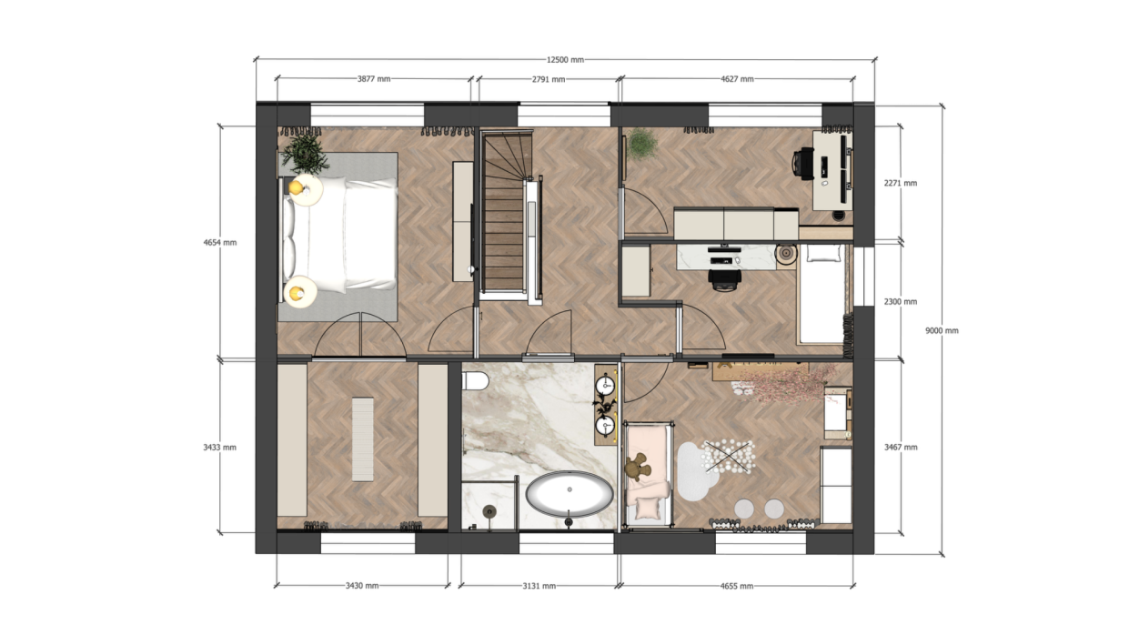 - Definitieve 2D plattegrond van de gekozen indeling met maatvoering
